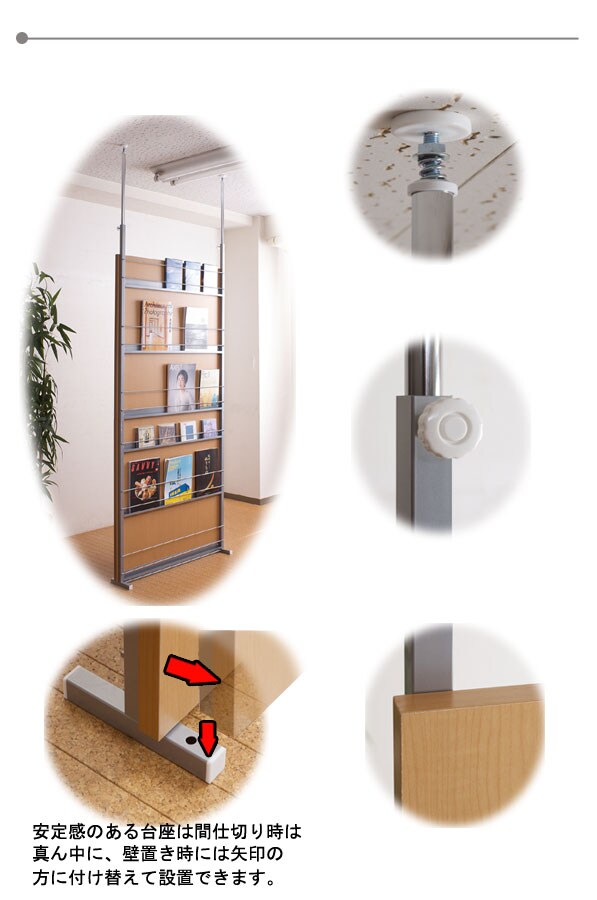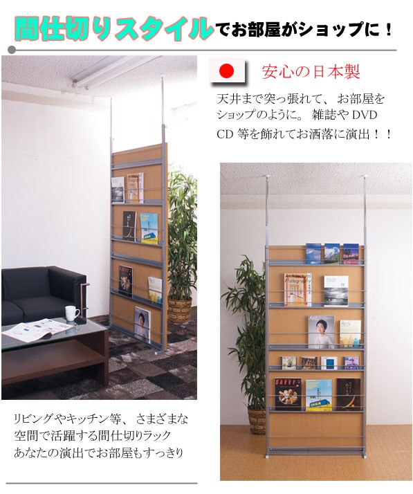 | 間仕切り仕様の突っ張りラック。 雑誌やCDを飾れる面と目隠しの仕切りの両面でお部屋にアクセント。 国産品で品質も◎。 脚の部分は壁に置くときと間仕切りにする時に付け替えて使用できるようになっています。 幅は2サイズでリビングやキッチン等、さまざまな空間で活躍し、あなたのお部屋を演出します。 |
