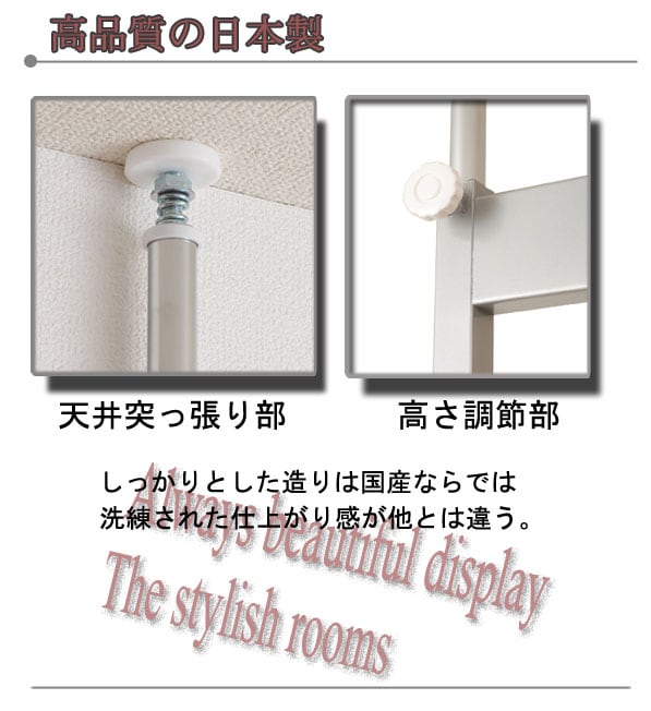 | ディスプレイして収納。 そんな言葉が似合うパーテーションでお部屋のインテリア性をUP! ちょっとした壁面スペースを有効活用でき、シルバー色がお部屋をスタイリッシュにしてくれます。 しっかりした造りは国産ならではで、洗練された仕上がり感が他とは違います。 天井に突っ張って設置できますので安定感抜群。 |
