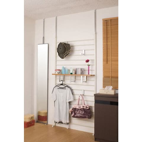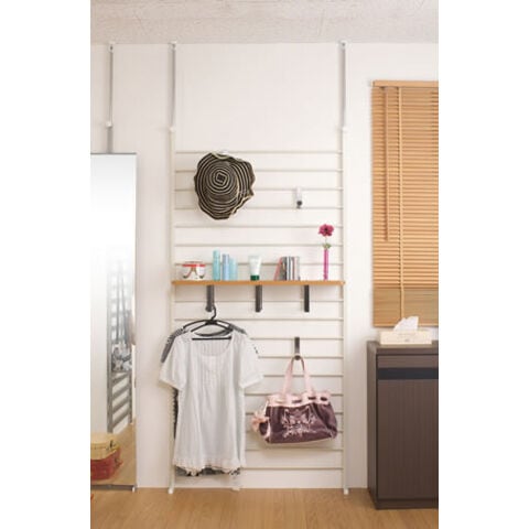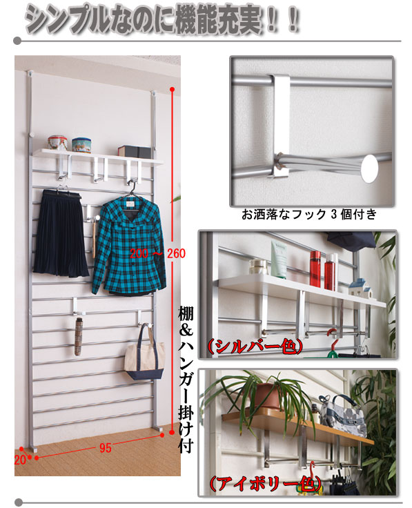 | 本体:(約)幅95(上部突っ張り部96)×奥行き20×高さ200~260cm 棚板可動間隔:(約)8.5cm 棚板サイズ:(約)幅89.5×奥行17.5×厚み2cm フック出幅:14cm |