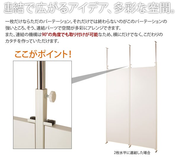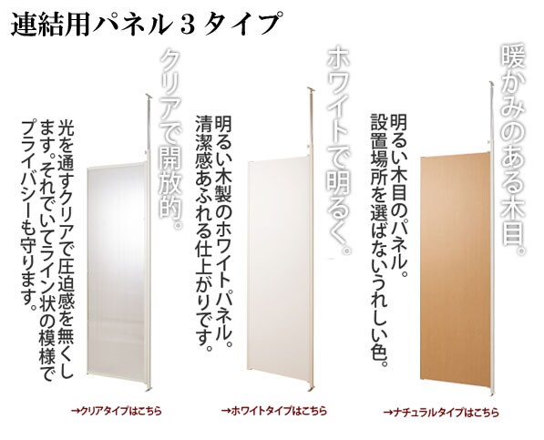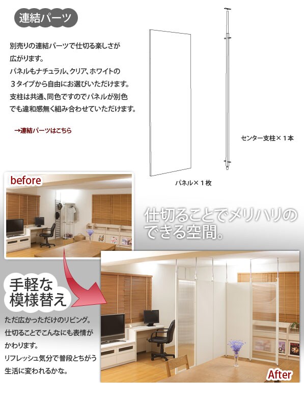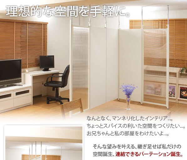 | パーテーションを設置するだけで簡単にお部屋を間仕切る事ができます。(本品は連結用です。) 別売りの本体用ボードとの連結アレンジ次第で間仕切りパターンは無限大。 自分流の素敵なお部屋に変身。 目隠し部分は清潔感際立つホワイト色、木目の温かみの落着きあるナチュラル色、完全にシャットアウトせずうっすら透ける半透明のお洒落な波状のポリカーボネイトの3タイプ。 全て同一タイプで間仕切るも良し。アクセントに半透明のクリアタイプを加えてみるも良し。 奥行も薄型で程よく目隠しできて圧迫感がありません。 |