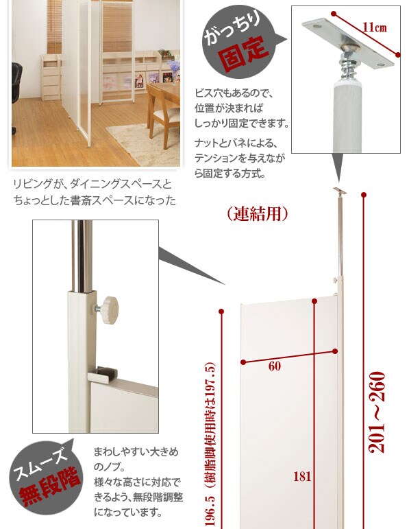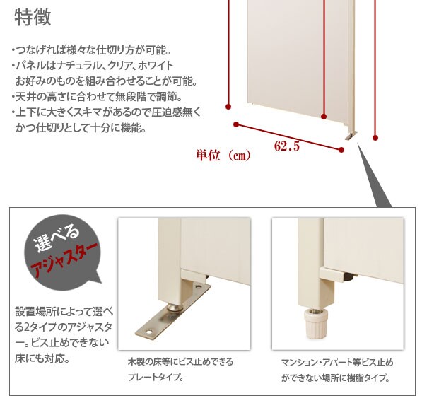 | 本体:(約)幅62.5×奥行2.5×高さ201~260cm パネル部:(約)幅60×奥行2.5×高さ181cm 補助金具脚:(約)奥行11cm |