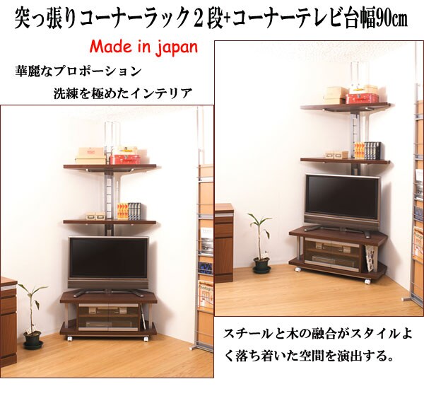 突っ張りコーナーラック2段+コーナーテレビ台 90cm幅 NJ-0026 日本製【送料無料】