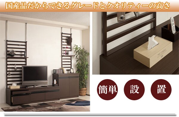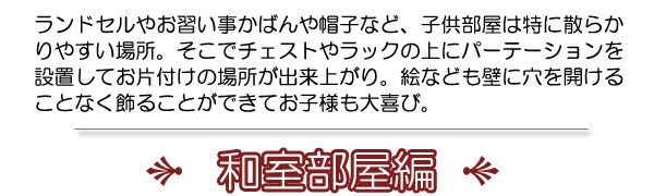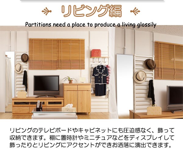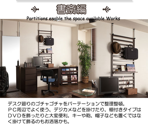 | 家具の後ろに簡単設置できるパーテーションが新登場。家具上の壁面を有効活用できる優れもの。壁に穴を開けたりせず簡単に設置できます。設置することにより天井まで突っ張れるので、家具の転倒防止の役割も備えた機能派! |
