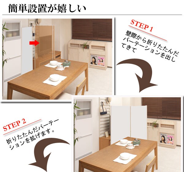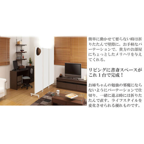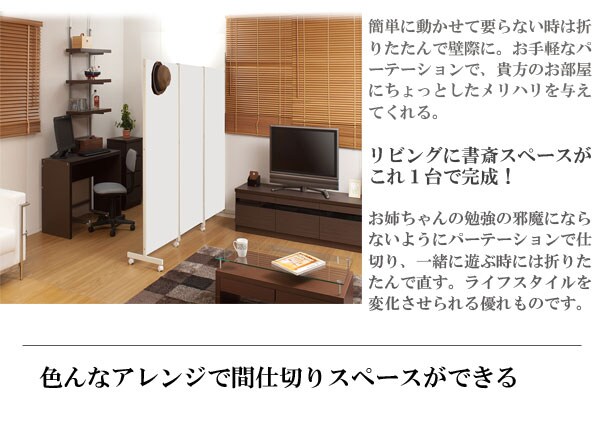 | キャスター付でサッと動かせるパーテーション。簡単に動かせて要らない時は折りたたんで壁際に。急な来客時等見せたくない場所をサッと目隠し。お手軽なパーテーションで、貴方のお部屋にちょっとしたメリハリを与えてくれる。リビングを間仕切って書斎スペースがこれ1台で完成! |
