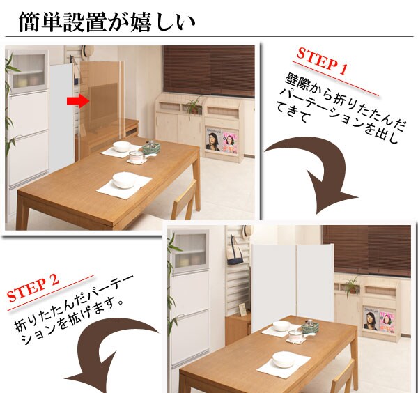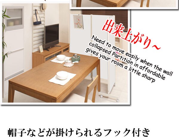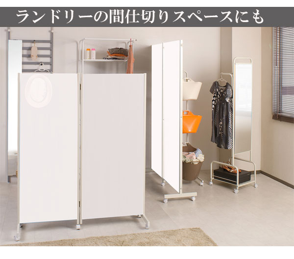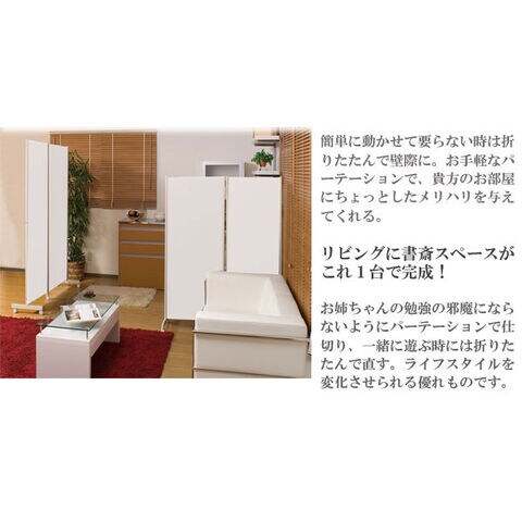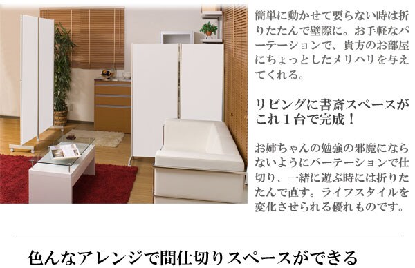 | キャスター付でサッと動かせるパーテーション。簡単に動かせて要らない時は折りたたんで壁際に。急な来客時等見せたくない場所をサッと目隠し。お手軽なパーテーションで、貴方のお部屋にちょっとしたメリハリを与えてくれる。リビングを間仕切って書斎スペースがこれ1台で完成! |