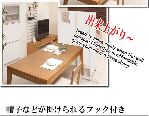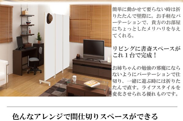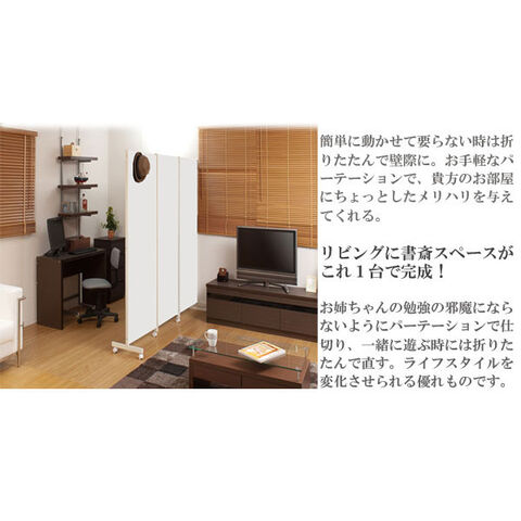 | キャスター付でサッと動かせるパーテーション。簡単に動かせて要らない時は折りたたんで壁際に。急な来客時等見せたくない場所をサッと目隠し。お手軽なパーテーションで、貴方のお部屋にちょっとしたメリハリを与えてくれる。リビングを間仕切って書斎スペースがこれ1台で完成! |