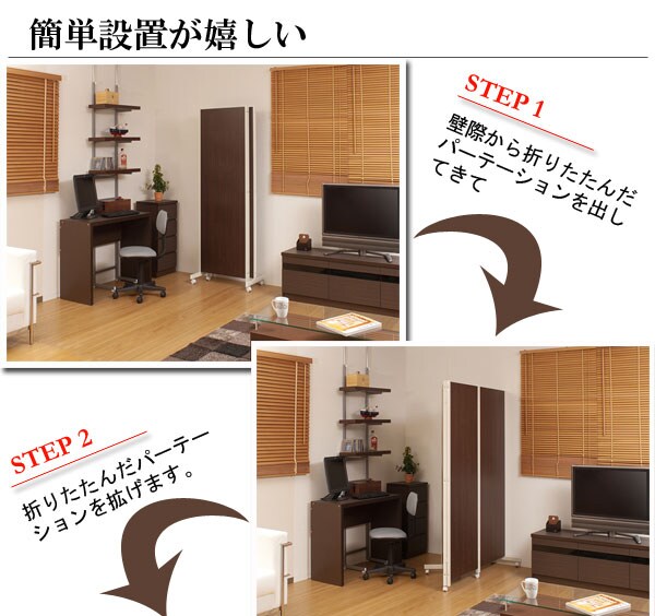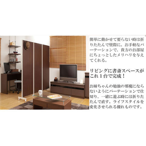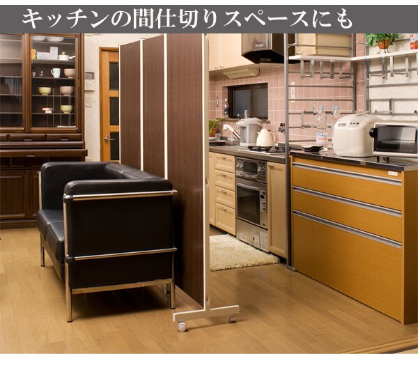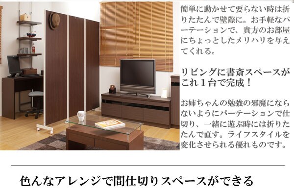| キャスター付でサッと動かせるパーテーション。簡単に動かせて要らない時は折りたたんで壁際に。急な来客時等見せたくない場所をサッと目隠し。お手軽なパーテーションで、貴方のお部屋にちょっとしたメリハリを与えてくれる。リビングを間仕切って書斎スペースがこれ1台で完成! |