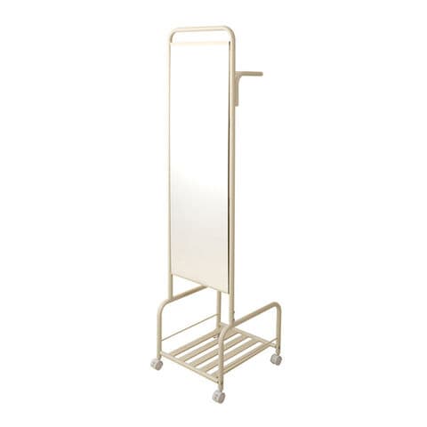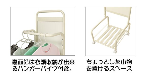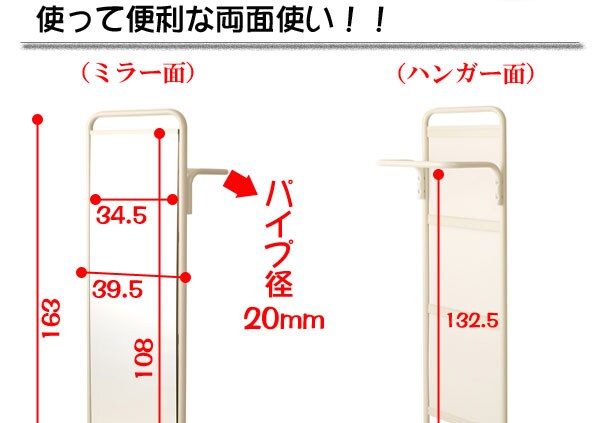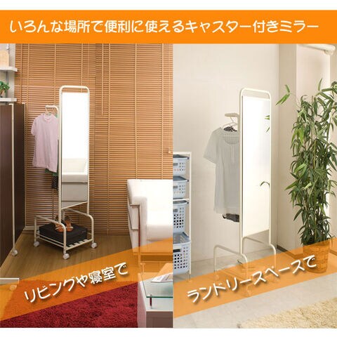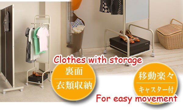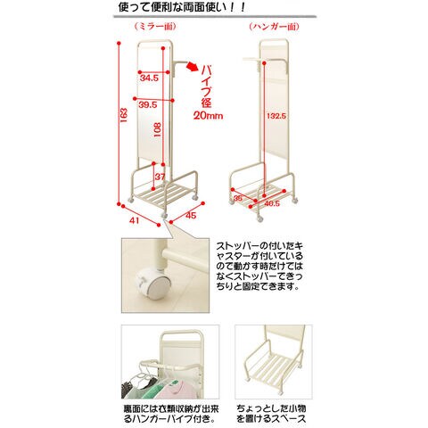 | ミラーの後ろにハンガーが付いてキャスター付きで移動も自由に!使って便利な両面使い!!ストッパー付きのキャスターが付いているので動かす時だけでなくストッパーでしっかり固定できます。ちょっとした小物を置ける棚付きでバッグ等収納できます。安定感のある仕様で移動も楽々。ランドリーでも、リビングでもちょっと掛けに欲しいハンガーラック。 |