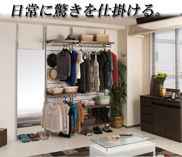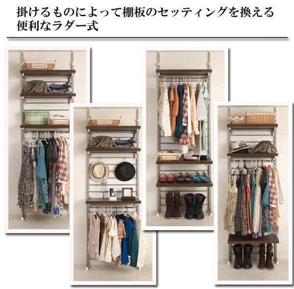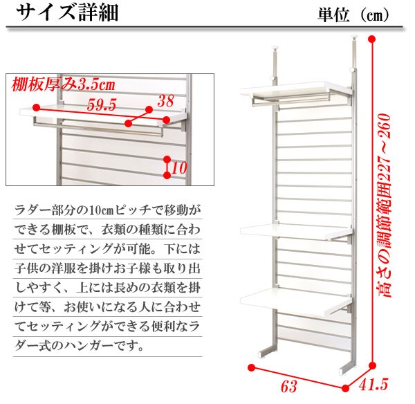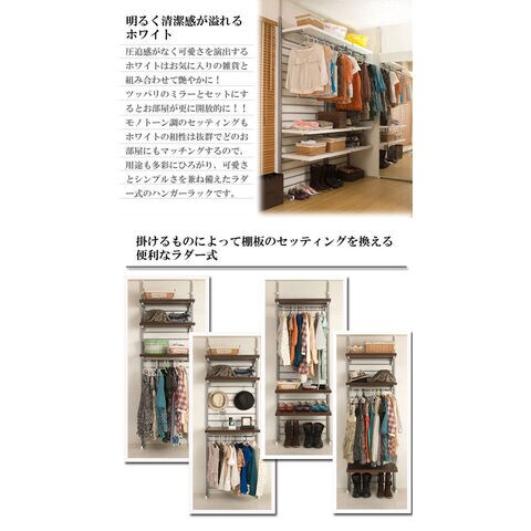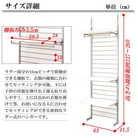 長年ご使用いただけるようにサイドフレームは2重構造になっているなど強度も抜群で安心・安全の高品質の国産品。背面は便利なラダー式で10ピッチで棚板のセッティングを換えられ、衣類の種類に合わせてセッティングが可能。下には子供の洋服を掛けお子様も取り出しやすく、上には長めの衣類を掛けて等、お使いになる人に合わせてセッティングができる便利なラダー式のハンガーです。