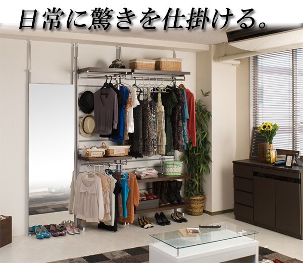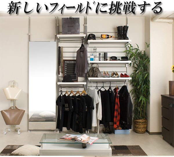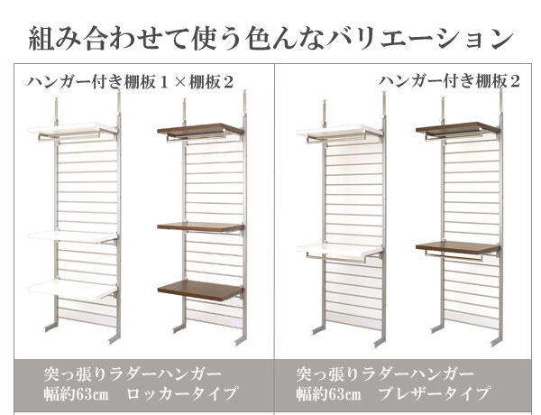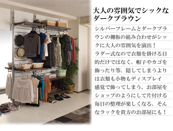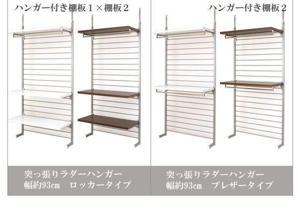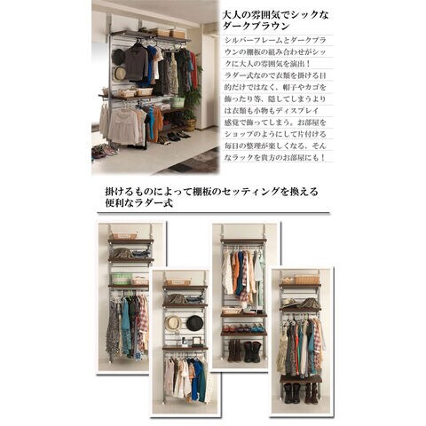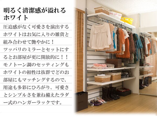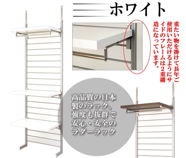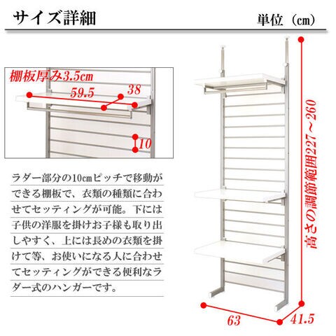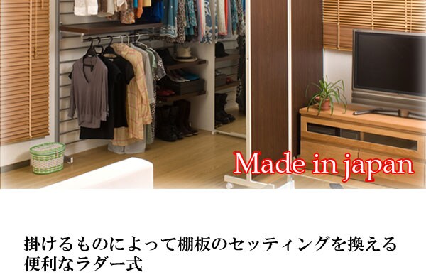 | 長年ご使用いただけるようにサイドフレームは2重構造になっているなど強度も抜群で安心・安全の高品質の国産品。背面は便利なラダー式で10ピッチで棚板のセッティングを換えられ、衣類の種類に合わせてセッティングが可能。下には子供の洋服を掛けお子様も取り出しやすく、上には長めの衣類を掛けて等、お使いになる人に合わせてセッティングができる便利なラダー式のハンガーです。 |