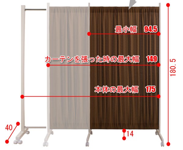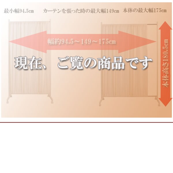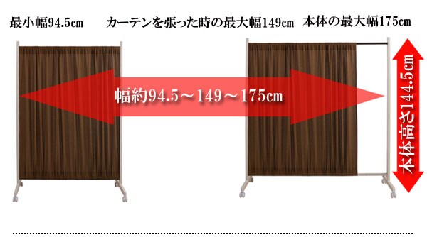 | 本体:(約)幅94.5~175×奥行40×高さ180.5cm カーテン最大伸張時本体幅:(約)149cm 下空間部高さ:(約)14cm 本体:スチール(エポキシ樹脂粉体塗装) 上下伸縮パイプ:スチール(クロームメッキ仕上げ) カーテン:綿100% 商品重量:6kg キャスター付きで必要な時にサッと出せる 伸縮機能 高級感あるワッフル地 日本製 |