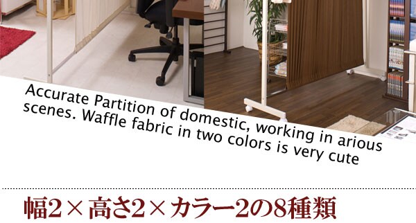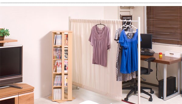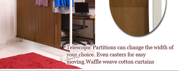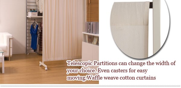 | キャスター付でサッと必要な時に出せる、間仕切りパーテーション。目隠し部分は、木製やパネルでは無く、お部屋に馴染む軽くて使いやすいワッフル地を使用。お部屋のサイズに合わせて伸縮できるのもうれしい機能。ワッフル地をいっぱいひろげて残り伸縮パイプをハンガー代わりにしてお気に入りの服をかけても良し。目隠し&ちょい掛けハンガーで急な来客時等に見せたくない所をサッと目隠し。 |