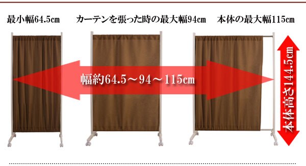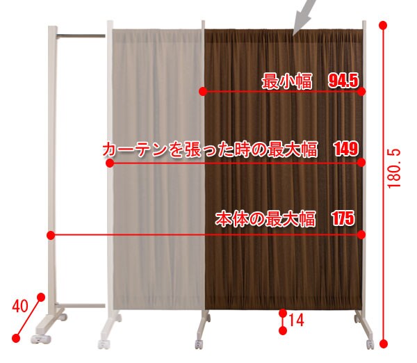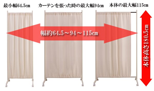 | 本体:(約)幅94.5~175×奥行40×高さ180.5cm カーテン最大伸張時本体幅:(約)149cm 下空間部高さ:(約)14cm 本体:スチール(エポキシ樹脂粉体塗装) 上下伸縮パイプ:スチール(クロームメッキ仕上げ カーテン:綿100% 商品重量:6kg キャスター付きで必要な時にサッと出せる 伸縮機能 高級感あるワッフル地 日本製 |