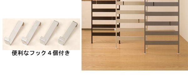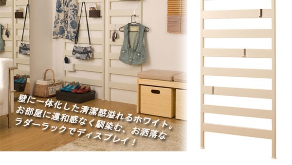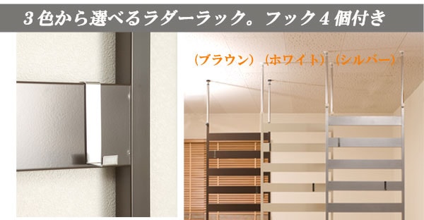 壁に一体化した清潔感溢れるホワイト。お部屋に違和感なく馴染む、お洒落なラダーラックでディスプレイ!スタイリッシュに飾るならやっぱりシルバー。お部屋にちょっぴりアクセントを入れてディスプレイ!モダンな雰囲気が何か落ち着きを与えてくれるブラウン。シックに飾ってお部屋がワンランクUP!フックが4個付属しているので使い勝手も良く、省スペースに収まるフレキシブル。※〔注意〕本商品は他のシリーズで販売されている、別売り棚板はセッティングできません。