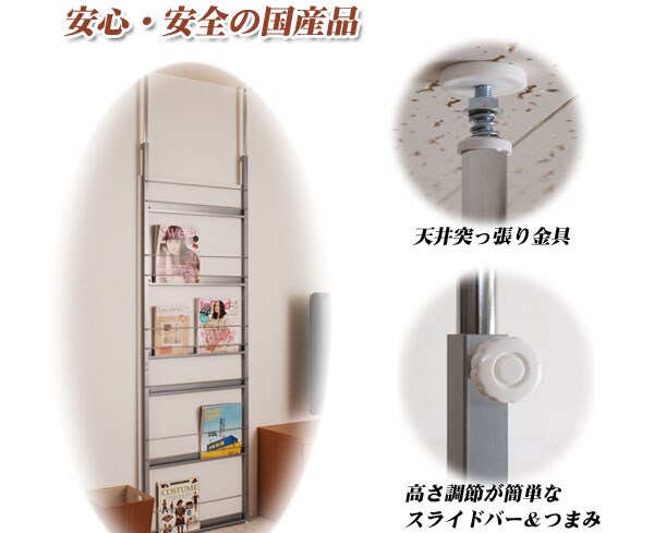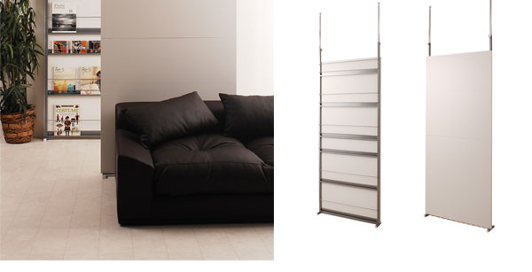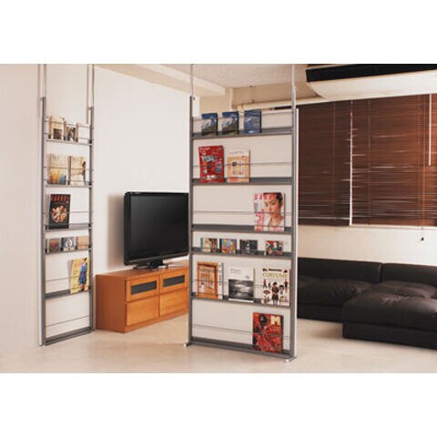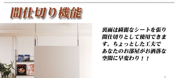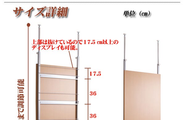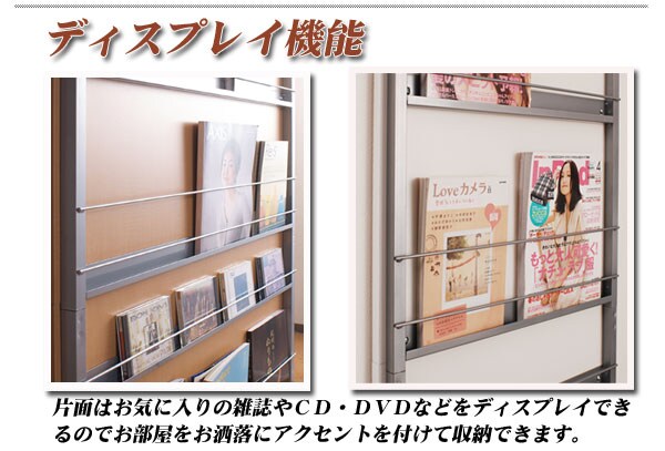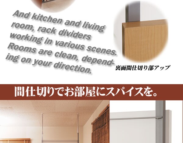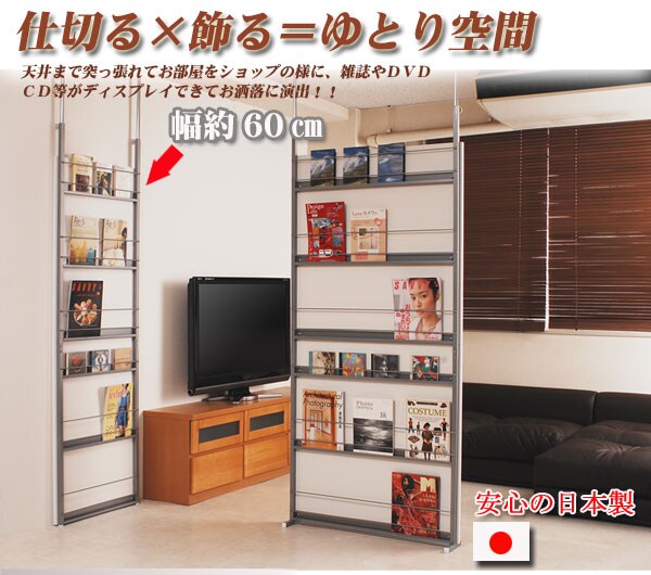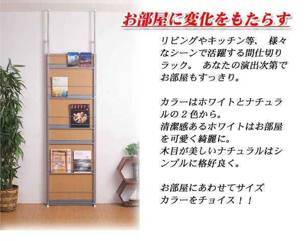 | 間仕切り仕様の突っ張りラック。雑誌やCDを飾れる面と目隠しの仕切りの両面でお部屋にアクセント。国産品で品質も◎。脚の部分は壁に置くときと間仕切りにする時に付け替えて使用できるようになっています。幅は2サイズでリビングやキッチン等、さまざまな空間で活躍し、あなたのお部屋を演出します。 | ■商品サイズ |