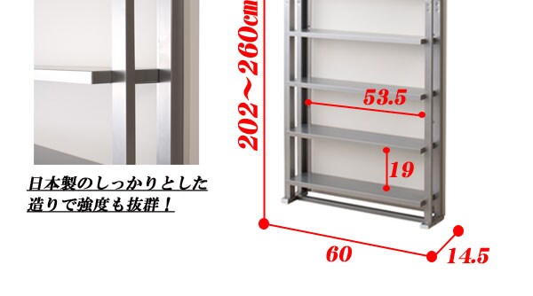 | 本体:(約)幅60×奥行14.5×高さ202~260cm 収納部内寸(各段):(約)幅53.5×奥行12.5×高さ19cm 目隠し部高さ:(約)182cm |