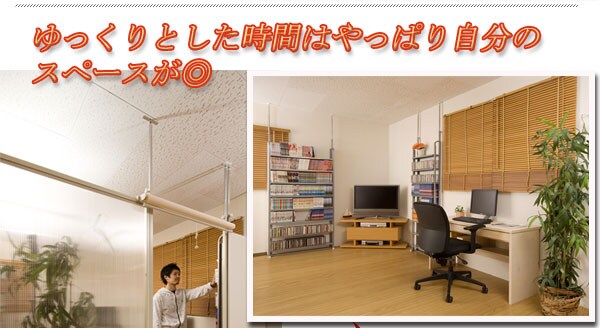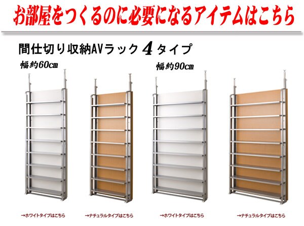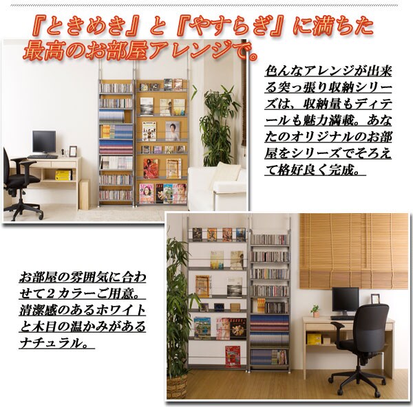 | 大好評突っ張りシリーズにAV収納ラックが新登場。収納とディスプレイ、間仕切りを組み合わせて、貴方だけのスペースを。壁面を有効利用して収納する他のシリーズとの組み合わせで色んなディスプレイが楽しめる壁際の収納から間仕切りの達人に変身。別シリーズの間仕切りと組み合わせて格好良いお部屋に、アレンジ次第で様々なパターンが作れます。壁に収納棚が欲しい、でも壁に穴等開けられないし…、そんなお悩みを解決する突っ張り式シリーズがおすすめです。収納棚の裏面は木製パネルになっているので間仕切りにも活躍。幅2サイズのナチュラル・ホワイトの2色から。 |