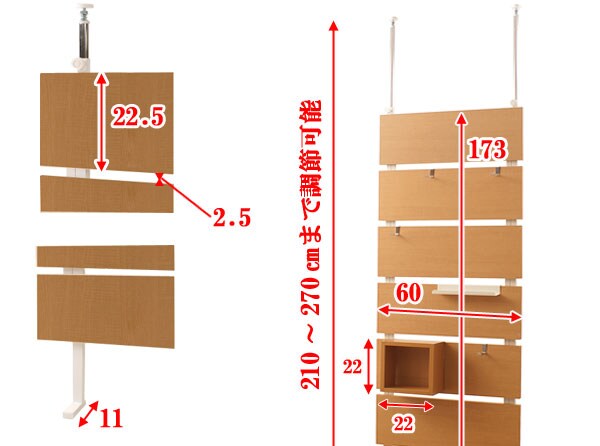 | 本体:(約)幅60×奥行11×高さ210~270cm 板1枚あたり:(約)幅60×高さ22.5cm(厚み18mm) 板~板の間隔:(約)2.5cm 目隠し部高さ:(約)173cm |