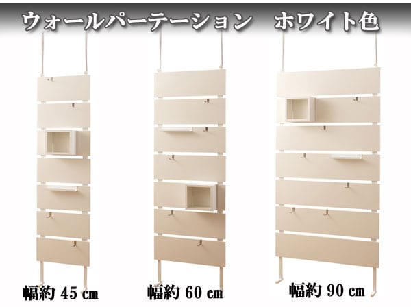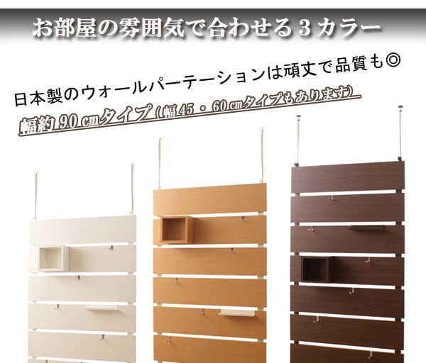 | 衣類や小物などを掛けて飾る。お部屋にアクセントが生まれるそんなパーテーションが誕生。ホワイト・ナチュラル・ダークブラウンの3カラーに幅45・60・90cmの3タイプをセレクト。お部屋の雰囲気に合わせて選べるパーテションで貴方のオリジナルのお部屋が完成。他のシリーズと合わせて色んなパターンでお部屋作りができます。もちろん、収納にもこだわりキューブ型ラック、フック、小物プレートまで付属した究極のディスプレイ収納ウォールパーテーション。白壁の雰囲気チェンジや、キズだらけになった壁紙の目隠しとしても、デザインと機能の融合がGOOD!シンプルなホワイト色・温かみあるナチュラル色・重厚感あるダークブラウン色、何セットかピックアップしてカラフルな空間にしてもお洒落。突っ張り式で安心・安全な日本製。 |