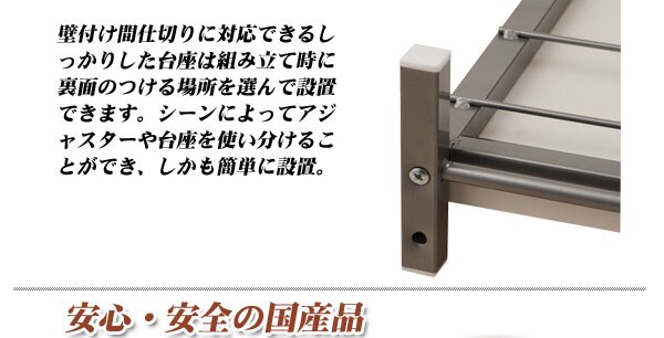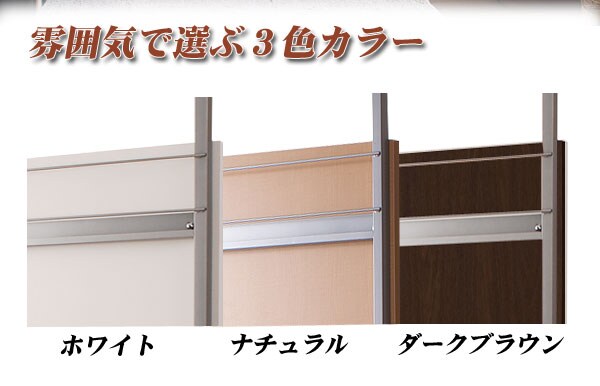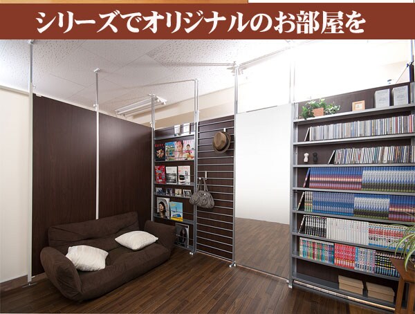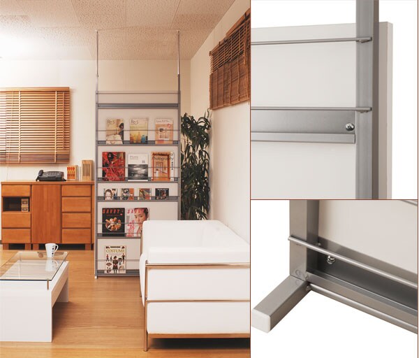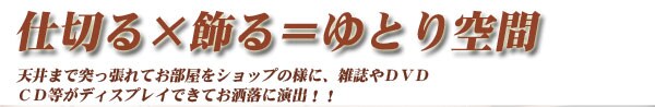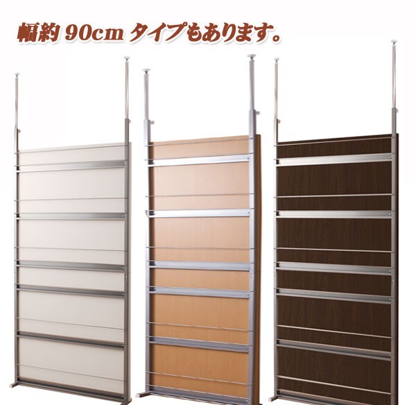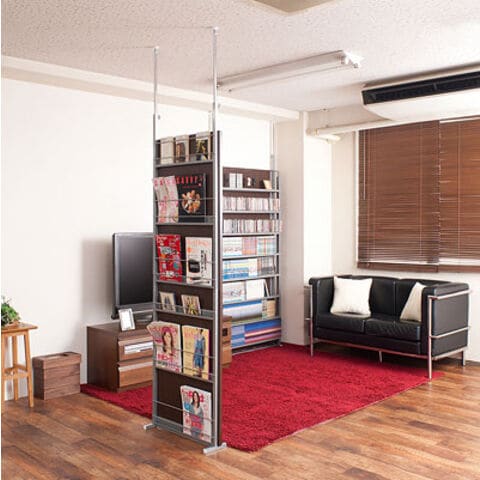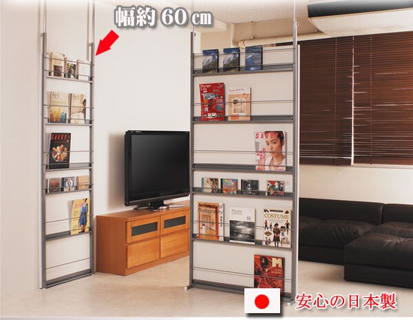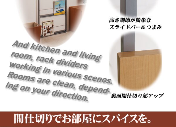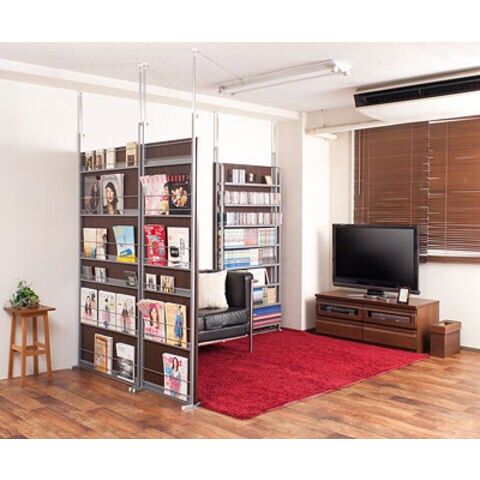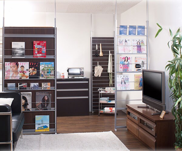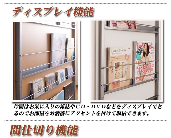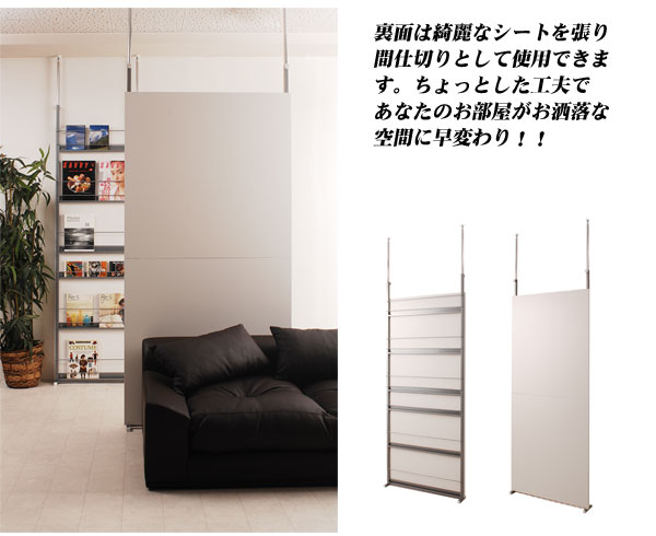 | 間仕切り仕様の突っ張りラック。雑誌やCDを飾れる面と目隠しの仕切りの両面でお部屋にアクセント。国産品で品質も◎。脚の部分は壁に置くときと間仕切りにする時に付け替えて使用できるようになっています。幅は2サイズでリビングやキッチン等、さまざまな空間で活躍し、あなたのお部屋を演出します。 |