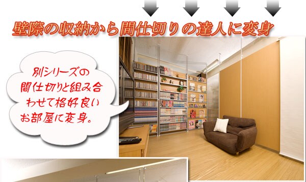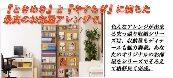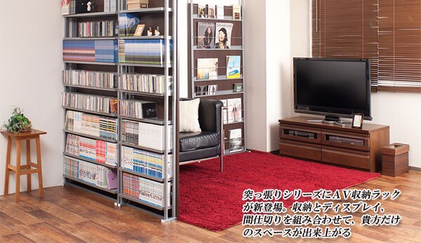 | 大好評突っ張りシリーズにAV収納ラックが新登場。収納とディスプレイ、間仕切りを組み合わせて、貴方だけのスペースを。壁面を有効利用して収納する他のシリーズとの組み合わせで色んなディスプレイが楽しめる壁際の収納から間仕切りの達人に変身。別シリーズの間仕切りと組み合わせて格好良いお部屋に、アレンジ次第で様々なパターンが作れます。壁に収納棚が欲しい、でも壁に穴等開けられないし…、そんなお悩みを解決する突っ張り式シリーズがおすすめです。収納棚の裏面は木製パネルになっているので間仕切りにも活躍。幅2サイズのナチュラル・ホワイトの2色から。 |