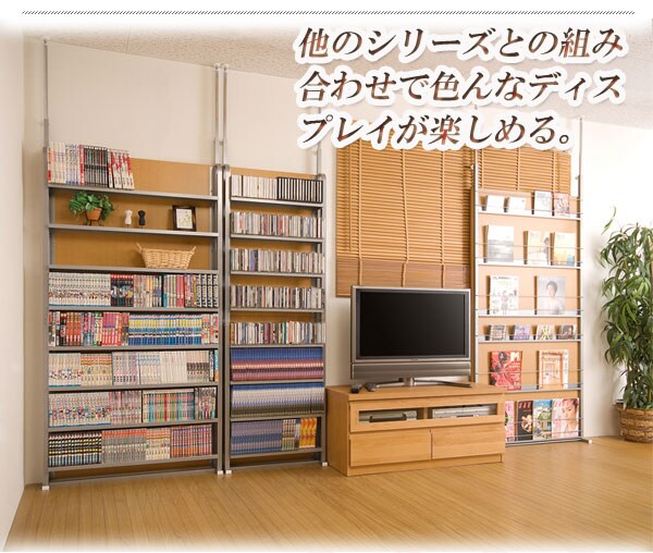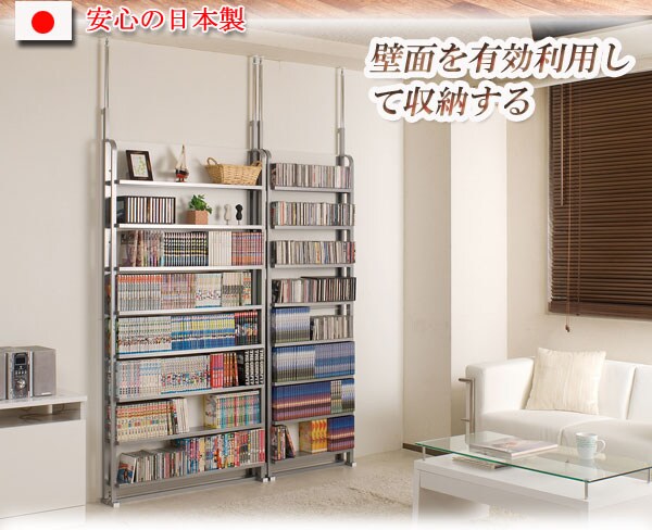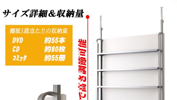 | 固定棚/8枚 耐荷重量/棚板1段当り:(約)8kg 収納量(1段あたり)/DVD:約55本 CD:約80枚 コミック:約55冊 |
