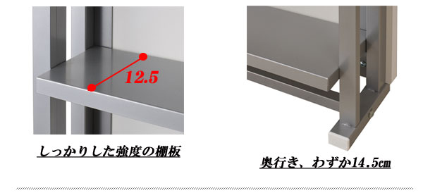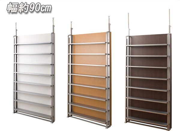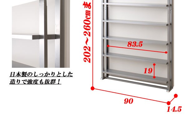 | 本体:(約)幅90×奥行14.5×高さ202~260cm 収納部内寸(各段):(約)幅83.5×奥行12.5×高さ19cm 目隠し部高さ:(約)182cm |