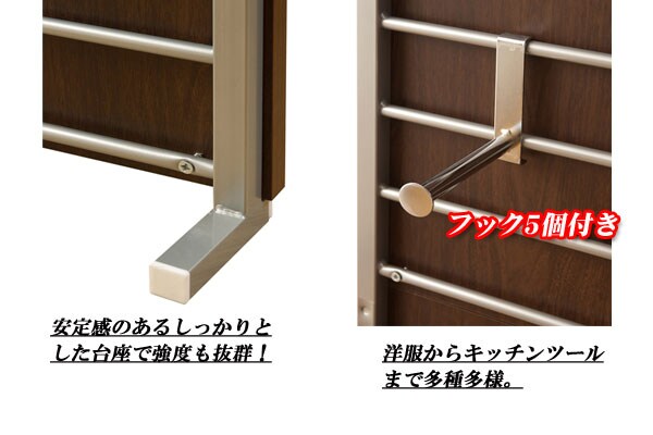 | 本体:(約)幅60×奥行き12×高さ202~260cm バックボード:(約)幅60×高さ180×厚み2cm フック可動間隔:(約)7.5cm フック出幅:(約)14cm |