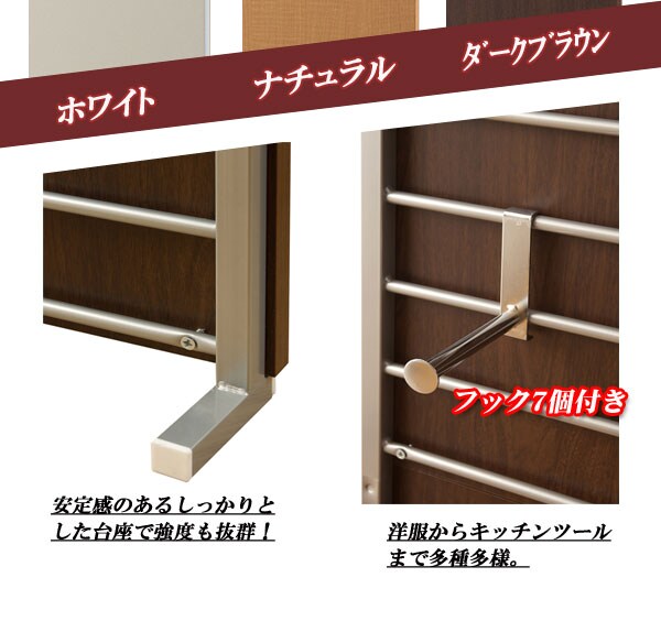 | 本体:(約)幅90×奥行き12×高さ202~260cm バックボード:(約)幅90×高さ180×厚み2cm フック可動間隔:(約)7.5cm フック出幅:(約)14cm |