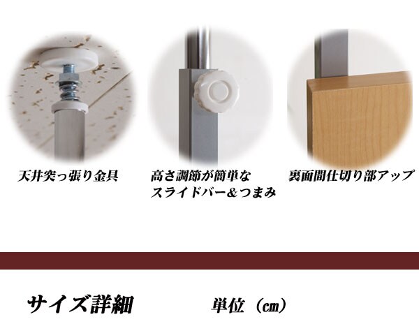 | 本体:(約)幅90×奥行き12×高さ202~260cm バックボード:(約)幅90×高さ180×厚み2cm フック可動間隔:(約)7.5cm フック出幅:(約)14cm |