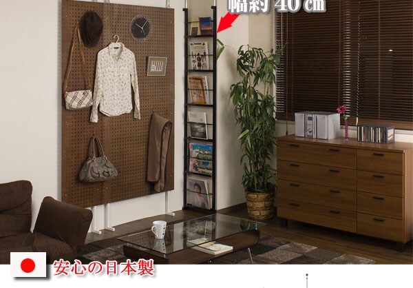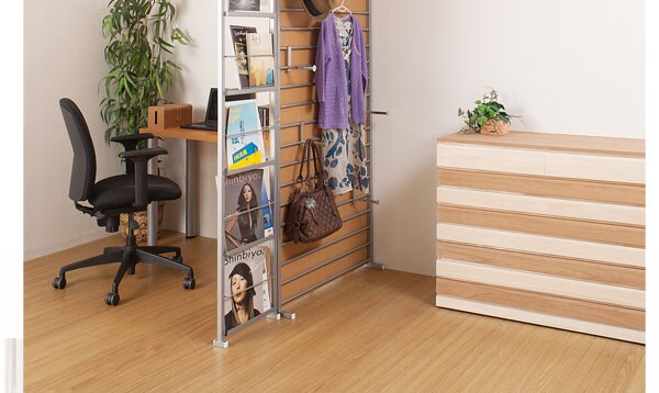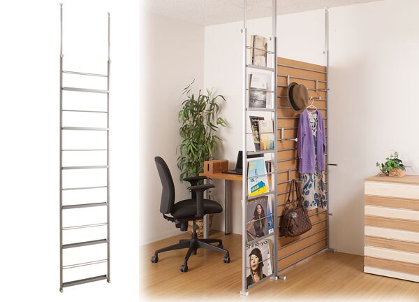 | 両面から出し入れ出来る間仕切りマガジンラック。フレームになっていますので圧迫感なく間仕切れます。 |