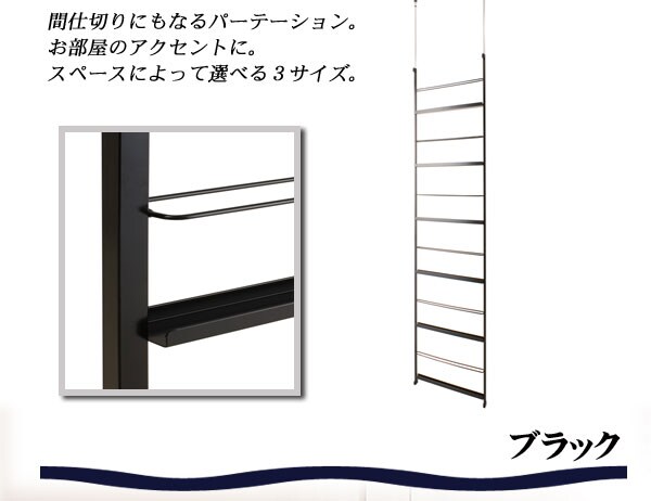 | 間仕切り両面使いの優れもの。リビングやキッチン等、様々なシーンで活躍する間仕切りラック。あなたの演出次第でお部屋もすっきり。カラーはブラックとシルバーの2色から。お部屋を渋く見せたいあなたはブラック。シンプルにスタイリッシュに見せたいあなたはシルバー。お部屋にあわせてサイズカラーをチョイス!!両面使いも出来る優れもの。デスク横などにも最適。他の突っ張りシリーズと組み合わせで、貴方のお好みのお部屋に。機能に加えてお洒落感覚を楽しめます。 |