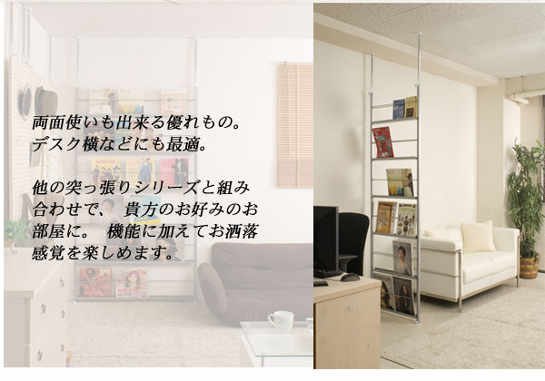 | 間仕切り両面使いの優れもの。リビングやキッチン等、様々なシーンで活躍する間仕切りラック。あなたの演出次第でお部屋もすっきり。カラーはブラックとシルバーの2色から。お部屋を渋く見せたいあなたはブラック。シンプルにスタイリッシュに見せたいあなたはシルバー。お部屋にあわせてサイズカラーをチョイス!!両面使いも出来る優れもの。デスク横などにも最適。他の突っ張りシリーズと組み合わせで、貴方のお好みのお部屋に。機能に加えてお洒落感覚を楽しめます。 |