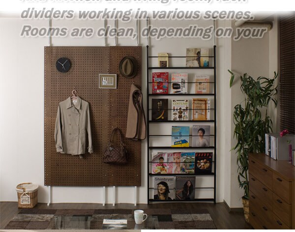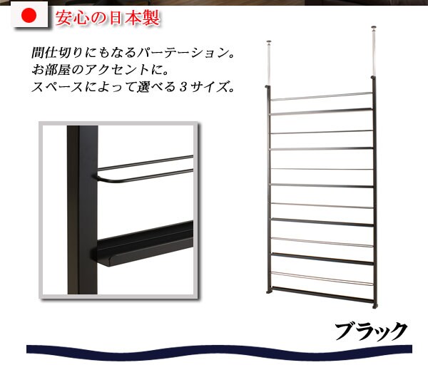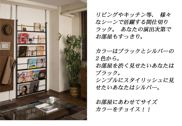 間仕切り両面使いの優れもの。リビングやキッチン等、様々なシーンで活躍する間仕切りラック。あなたの演出次第でお部屋もすっきり。カラーはブラックとシルバーの2色から。お部屋を渋く見せたいあなたはブラック。シンプルにスタイリッシュに見せたいあなたはシルバー。お部屋にあわせてサイズカラーをチョイス!!両面使いも出来る優れもの。デスク横などにも最適。他の突っ張りシリーズと組み合わせで、貴方のお好みのお部屋に。機能に加えてお洒落感覚を楽しめます。