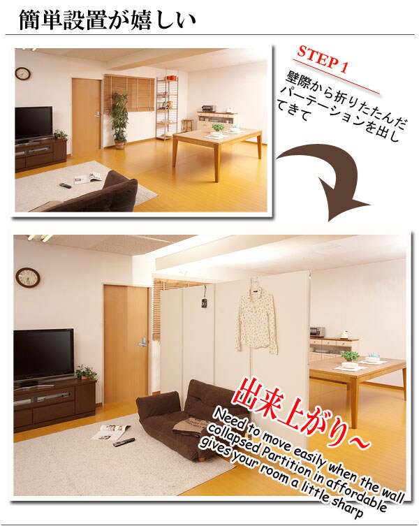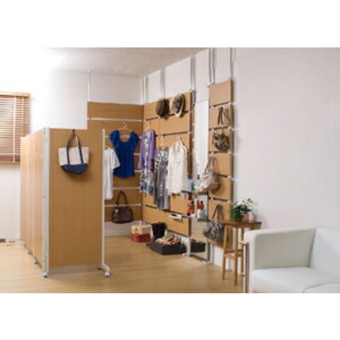 | キャスター付でサッと動かせるパーテーション。簡単に動かせて要らない時は折りたたんで壁際に。急な来客時等見せたくない場所をサッと目隠し。お手軽なパーテーションで、貴方のお部屋にちょっとしたメリハリを与えてくれる。リビングを間仕切って書斎スペースがこれ1台で完成!お姉ちゃんの勉強の邪魔にならないようにパーテーションで仕切り、一緒に遊ぶ時には折りたたんで直す。ライフスタイルを変化させられる優れものです。色んなアレンジで間仕切りスペースができる。ちょっとした、小物が掛けられるフックが4個付いて、大変便利!帽子やデジカメ、他にも色々。大好評の3連タイプに続き4連・5連タイプが新登場! |