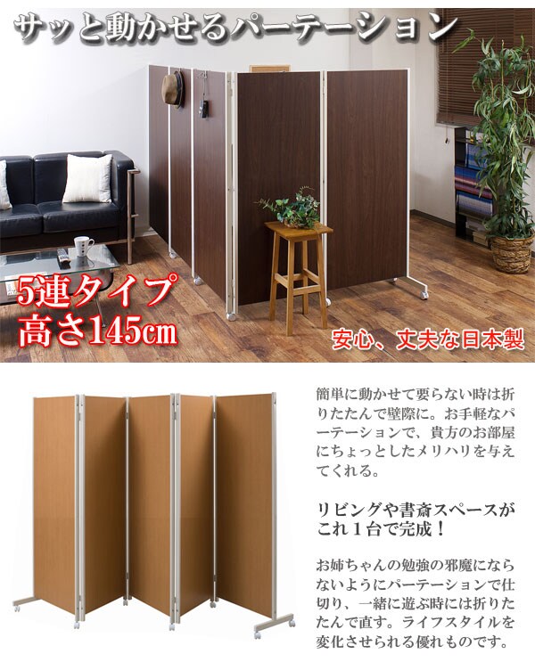 キャスター付きパーテーション5連H145 ナチュラル【送料無料】