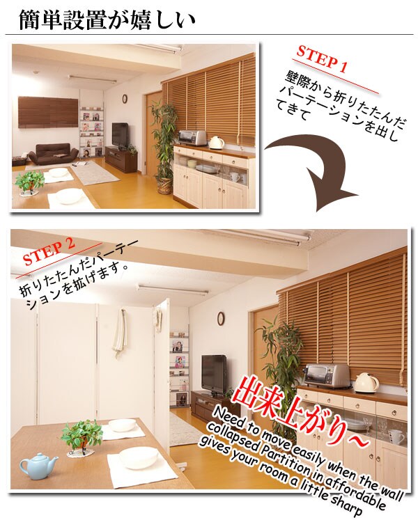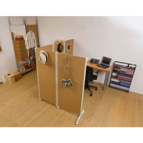 | キャスター付でサッと動かせるパーテーション。簡単に動かせて要らない時は折りたたんで壁際に。急な来客時等見せたくない場所をサッと目隠し。お手軽なパーテーションで、貴方のお部屋にちょっとしたメリハリを与えてくれる。リビングを間仕切って書斎スペースがこれ1台で完成!お姉ちゃんの勉強の邪魔にならないようにパーテーションで仕切り、一緒に遊ぶ時には折りたたんで直す。ライフスタイルを変化させられる優れものです。色んなアレンジで間仕切りスペースができる。ちょっとした、小物が掛けられるフックが4個付いて、大変便利!帽子やデジカメ、他にも色々。大好評の3連タイプに続き4連・5連タイプが新登場! |