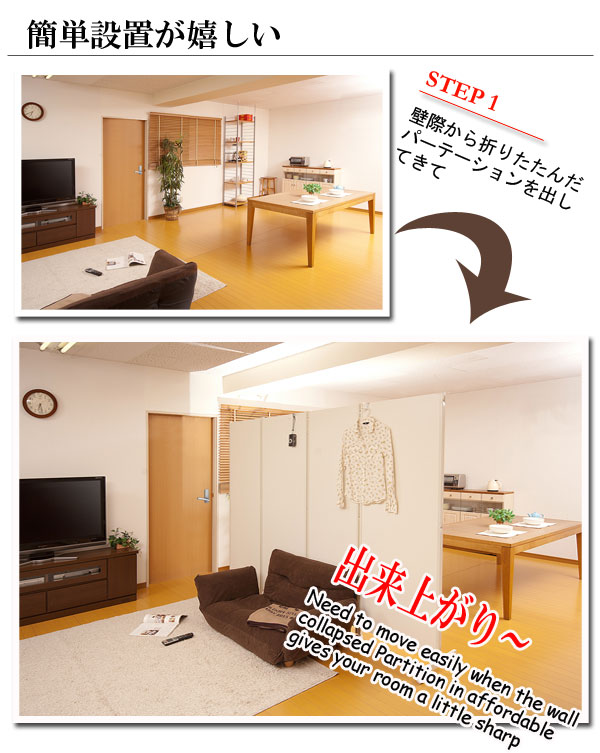 | キャスター付でサッと動かせるパーテーション。簡単に動かせて要らない時は折りたたんで壁際に。急な来客時等見せたくない場所をサッと目隠し。お手軽なパーテーションで、貴方のお部屋にちょっとしたメリハリを与えてくれる。リビングを間仕切って書斎スペースがこれ1台で完成!お姉ちゃんの勉強の邪魔にならないようにパーテーションで仕切り、一緒に遊ぶ時には折りたたんで直す。ライフスタイルを変化させられる優れものです。色んなアレンジで間仕切りスペースができる。ちょっとした、小物が掛けられるフックが4個付いて、大変便利!帽子やデジカメ、他にも色々。大好評の3連タイプに続き4連・5連タイプが新登場! |