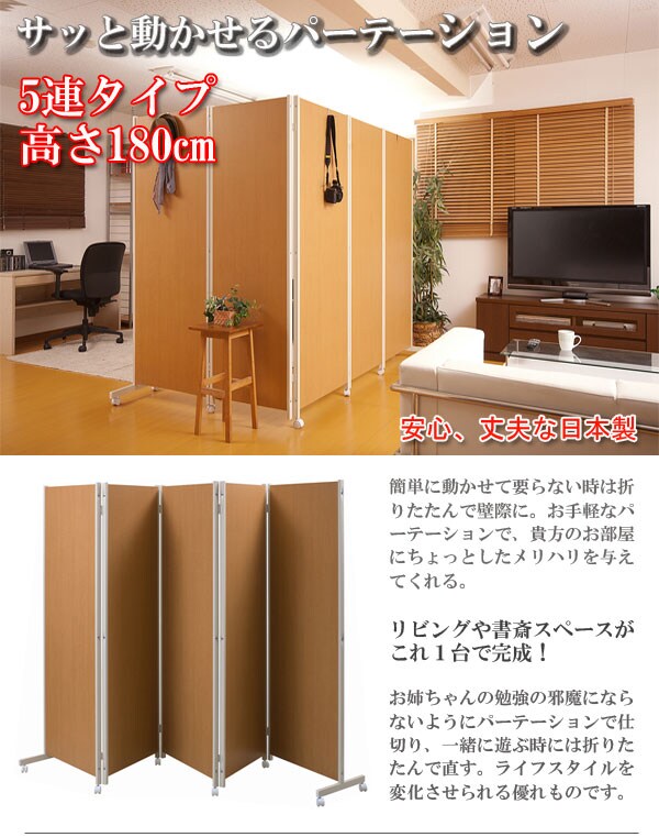 キャスター付きパーテーション5連H180 ナチュラル【送料無料】