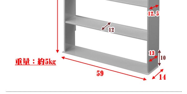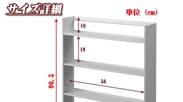 ■商品サイズ/本体:(約)幅59×奥行14×高さ90.5cm、収納部内寸:(約)幅56×奥行12×高さ(最上部)10(その他)19cm、巾木よけ:(約)幅1×高さ10cm、材質/本体:スチール(エポキシ樹脂粉体塗装)
