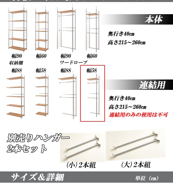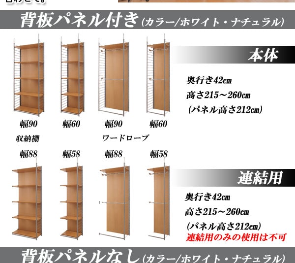 ■商品サイズ/本体:(約)幅58×奥行40×高さ215~260cm、収納部内寸:(約)幅55×奥行34.5×高さ【上下約均等に設置した場合】(上)93(下)90cm、ラダー間隔:(約)8cm