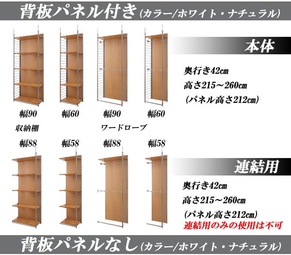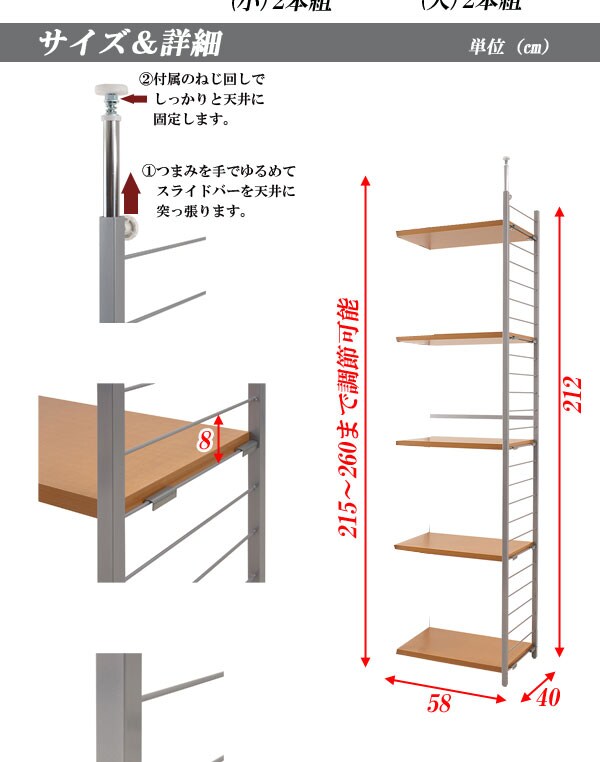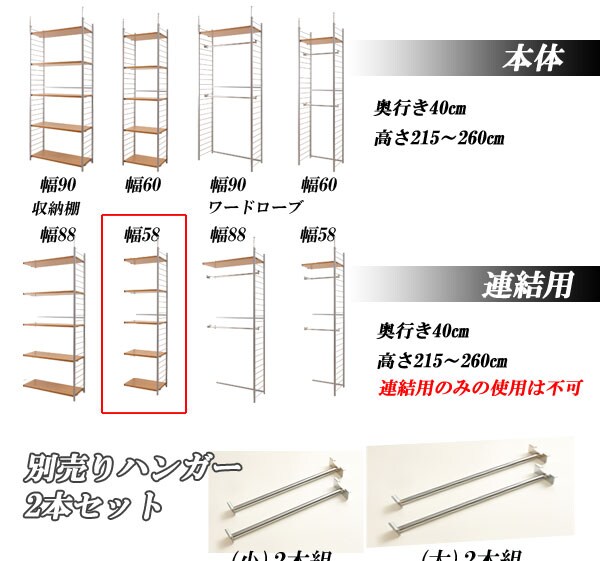 ■商品サイズ/本体:(約)幅58×奥行40×高さ215~260cm、収納部内寸:(約)幅55×奥行34.5×高さ8cm間隔で25段階