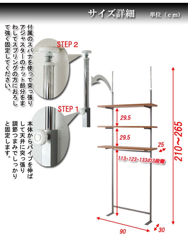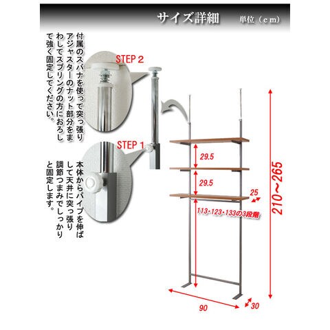 ■商品サイズ/本体:(約)幅90×奥行30×高さ210~265cm、棚板サイズ:(約)幅90×奥行25cm、棚~棚高さ:(約)29.5cm