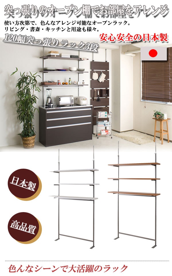 日本製 突っ張り ウォールシェルフ 3段 幅120 ホワイト 白 大容量 つっぱり ラック 壁面 突っ張り棚 伸縮 省スペース 木製 キッチン 北欧【送料無料】
