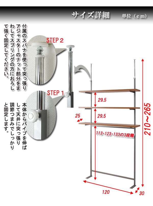 ■商品サイズ/本体:(約)幅120×奥行30×高さ210~265cm、棚板サイズ:(約)幅120×奥行25cm、棚~棚高さ:(約)29.5cm