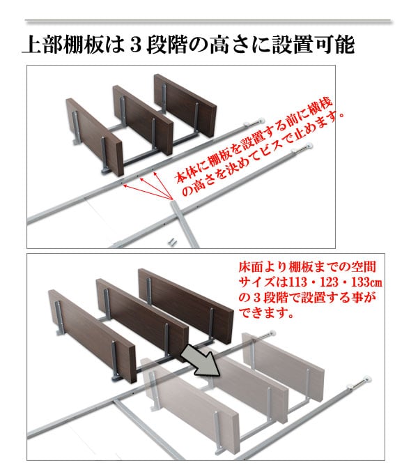 ■フレーム:スチール(エポキシ樹脂粉体塗装)、棚板:プリント紙化粧繊維板、耐荷重量/棚板:約5kg、棚板可動式(地面から113・123・133cmの3段階)※棚板1枚ごとの単体可動はできません。