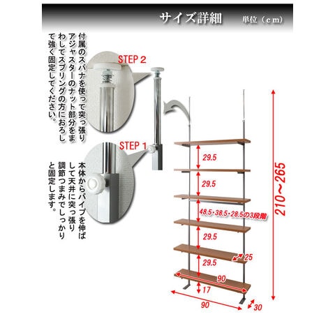 ■商品サイズ/本体:(約)幅90×奥行30×高さ210~265cm、棚板サイズ:(約)幅90×奥行25cm、棚~棚高さ:(約)29.5cm