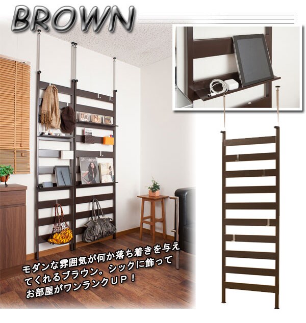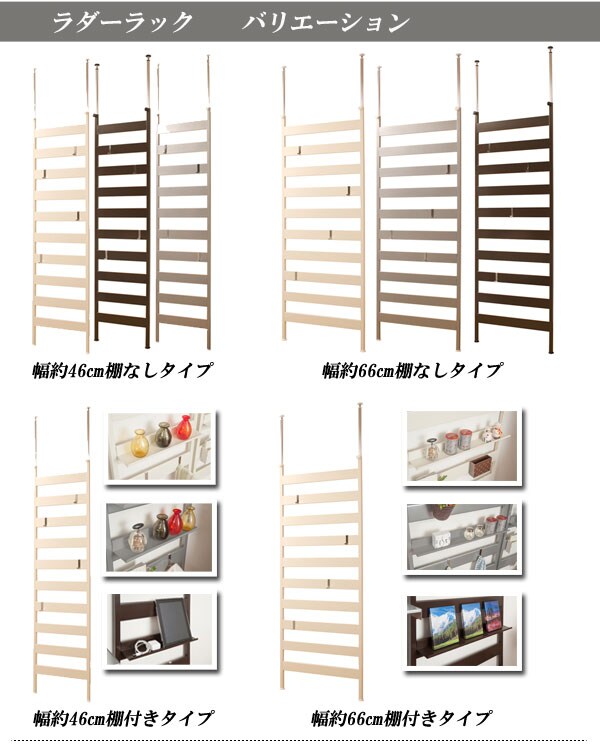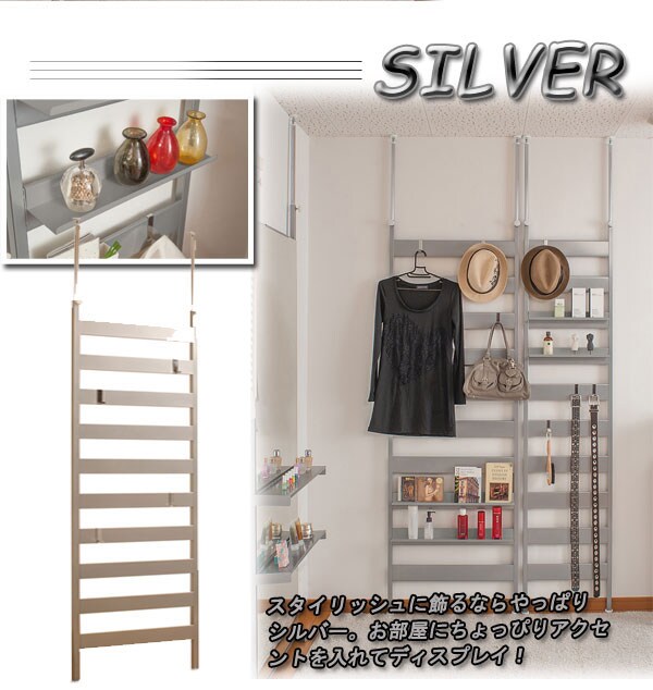 | 壁に一体化した清潔感溢れるホワイト。お部屋に違和感なく馴染む、お洒落なラダーラックでディスプレイ!スタイリッシュに飾るならやっぱりシルバー。お部屋にちょっぴりアクセントを入れてディスプレイ!モダンな雰囲気が何か落ち着きを与えてくれるブラウン。シックに飾ってお部屋がワンランクUP!フックが4個付属しているので使い勝手も良く、省スペースに収まるフレキシブル。専用棚板2枚付きが新登場 ※〔注意〕本商品は他のシリーズで販売されている、別売り棚板はセッティングできません。 |