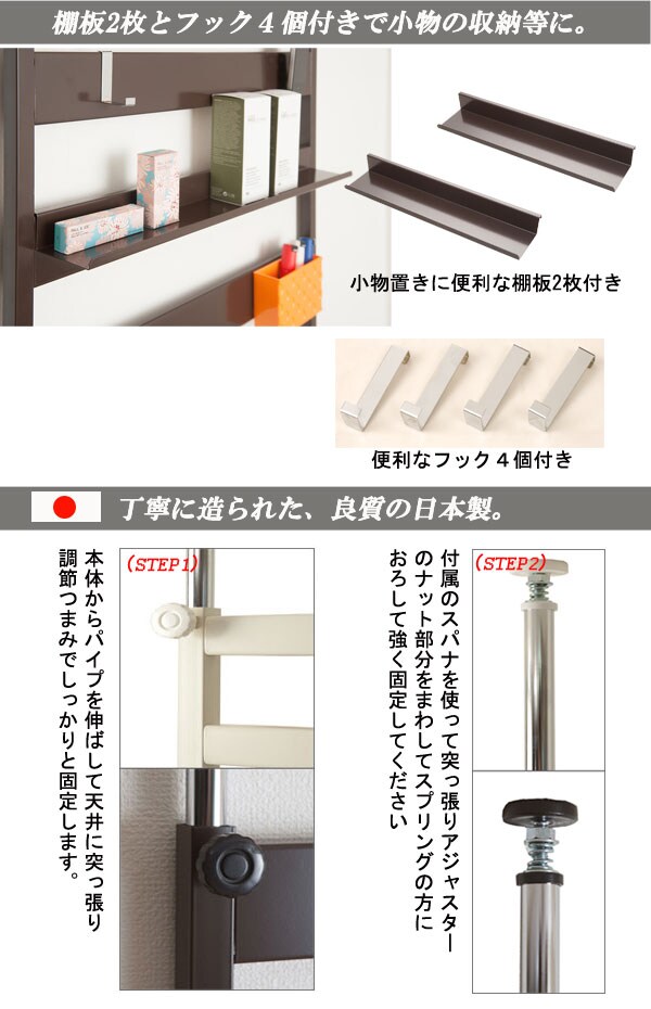 | フック4ヶ付き 棚板2枚付き 薄型省スペース設計 商品重量:約7kg 日本製 組立式 |