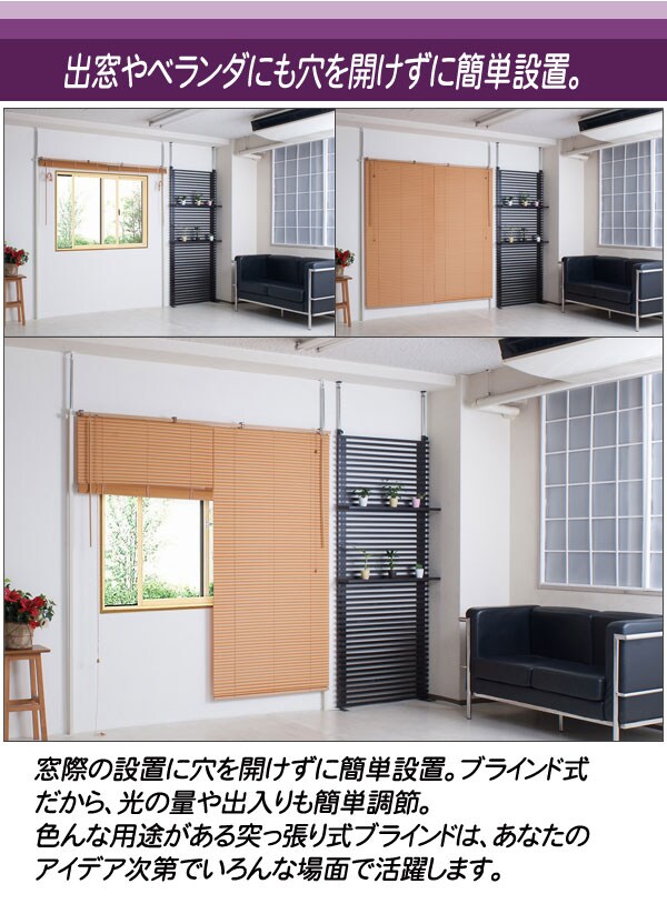 | 賃貸マンション等に最適な壁にネジ穴を開けなくても設置できるブラインドが新登場!突っ張り式で間仕切りにもなり使い方は無限大。扉など取っ払ってブラインドにすれば光量も調節できて開放感&お洒落な部屋に変身。シングルタイプ・幅広のダブルタイプとスペースに合わせて選べます。カラーはナチュラルとブラウンの2色から。 |